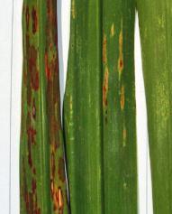 Síntomas tempranos comienzan con puntos cloróticos o moteado de las hojas más viejas. Más adelante, estas lesiones se fusionar para producir pecas de color marrón naranjo, dando a las hojas una apariencia oxidada. Hojas jóvenes permanecen frecuentemente verdes.