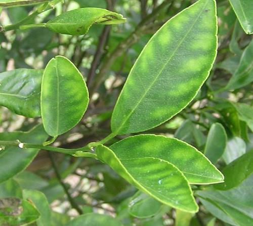 Deficiencia de magnesio en hojas de limón.