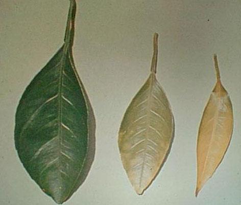 Las hojas más viejas son de color verde pálido a amarillo y se caen, la vida de la hoja se reduce de 1-3 años a 6 meses. Las nervaduras foliares tienen un color claro que tiende a blanco.