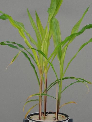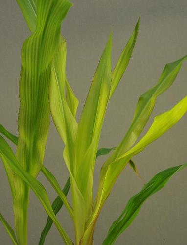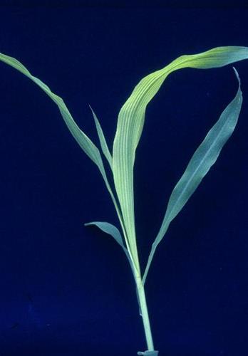 La planta muestra un crecimiento reducido y erecto. Las hojas jóvenes tienen un color pálido uniforme, con clorosis internerval. En los márgenes y base de las hojas puede observarse una línea parda.