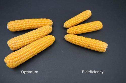 Deficiencia de fósforo en mazorcas (derecha).